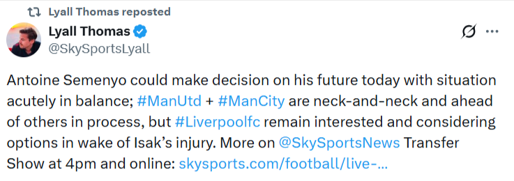 We have intermittently checked Sky Sports and it turns out that if Semenyo did indeed make a decision on Monday, he kept it to himself. Does that count? Did Lyall Thomas actually nail it? We will literally never know.