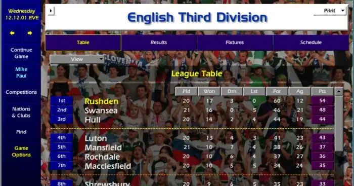 Right, let’s get down to business. I’ve just about come back down from the cloud I was floating around on after the Fulham result, but CM01/02 waits for no man, and we have to make sure we don’t get distracted by famous cup victories and take our foot off the gas in the league. We’ve got two Division 3 games against Macclesfield and Bristol Rovers before we face three away cup fixtures in a row: Preston in the League Cup quarter-final, QPR in the FA Cup second round, and then the mighty Brentford at Griffin Park in the first round of the Vans Trophy.